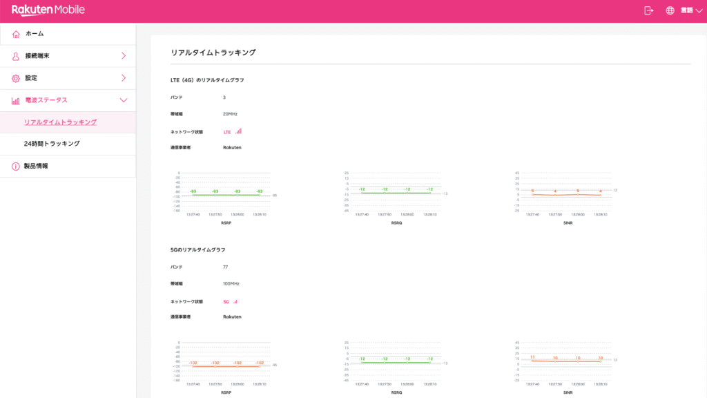 ブラウザから管理用画面(http://192.168.210.1/)にアクセスして、[電波ステータス]ー[リアルタイムトラッキング]の画面でLTE(4G)または5Gのリアルタイム(10秒間隔)の電波状況のグラフを見ることができます。
